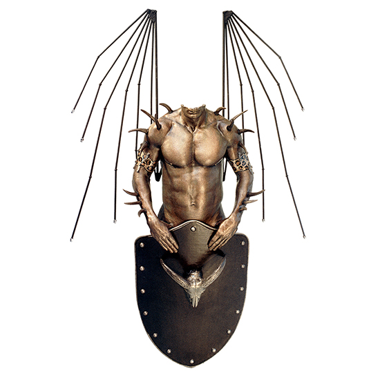 Life-size cast gypsum torso, steel wings, and fiberglass shield with ram skull. Wall mounted.Read news about this sculpture