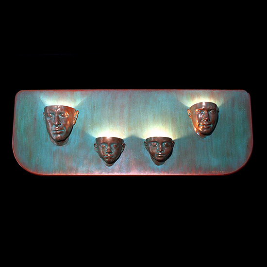 Part of series of lighting fixtures designed for former playmate Barbie Benton. Cast gypsum on wood. 60” wide in copper verde finish.