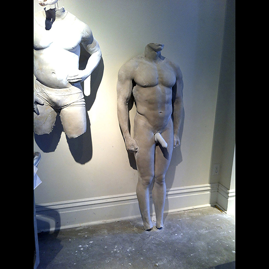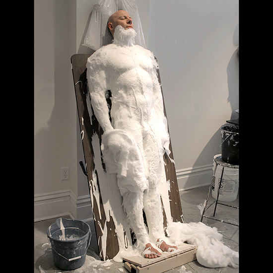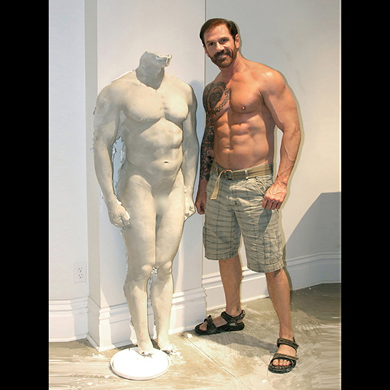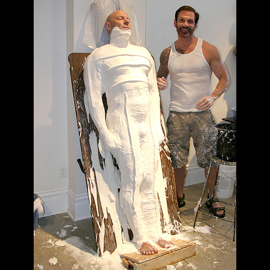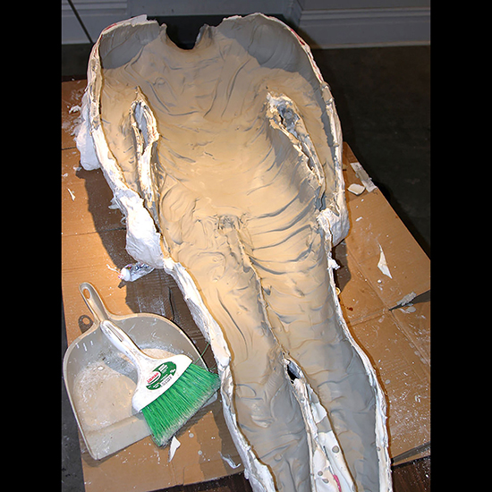 The model, “Bill” hits the pose. The angled posing platform distributes his weight across his back, enabling to essentially stand throughout the molding process.