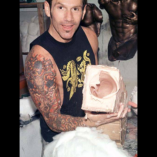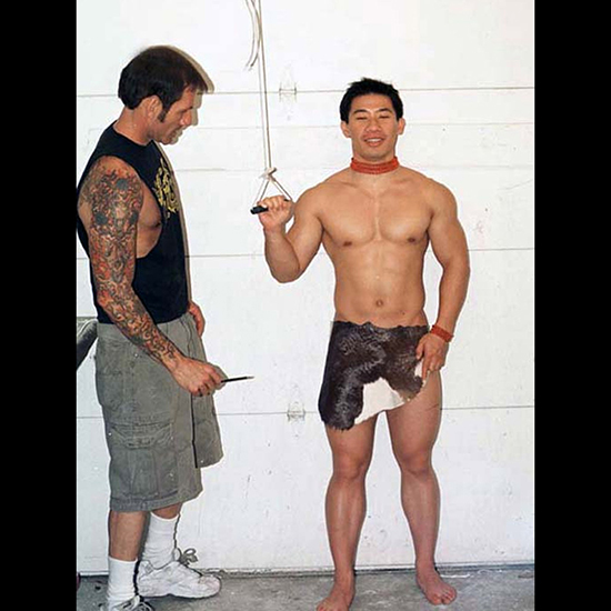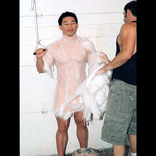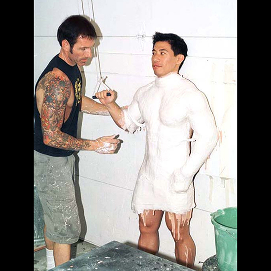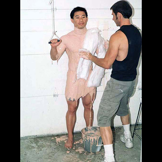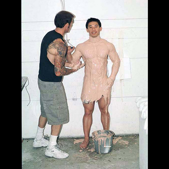 The process of alginate, cotton, and plaster gauze is repeated to cast Steve’s right and left arms again. Note the wooden rod, which holds a place for a trident.